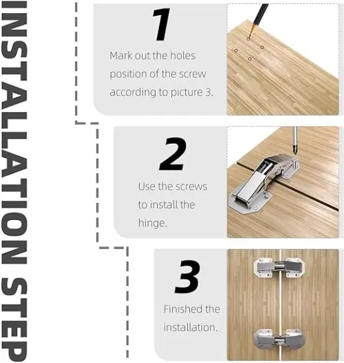 Our hinge requires no pre-drilling and can be easily installed with a screwdriver.  Whether you need full overlay, half overlay, or inset installation, our hinge fits perfectly and comes with screws included.
